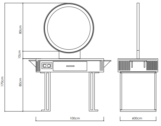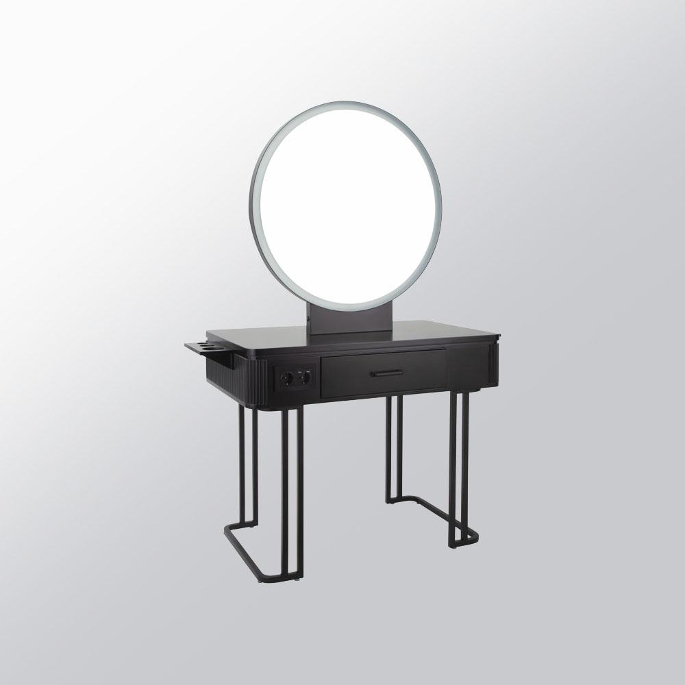 El tocador Nicole es una estación de trabajo de peluquería de líneas elegantes, pensada para salones que buscan estilo, orden y una iluminación profesional en el puesto.