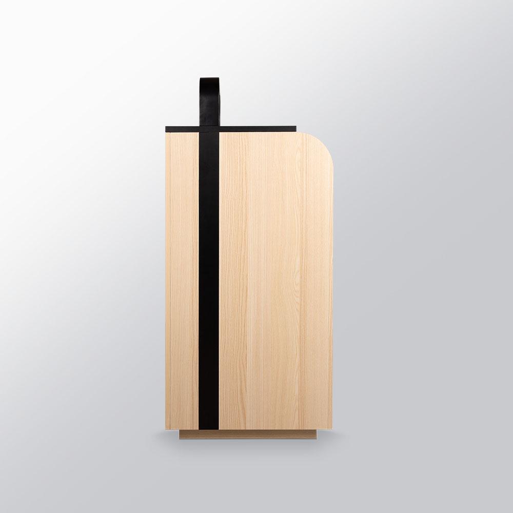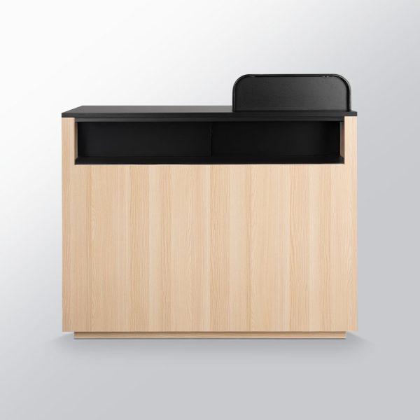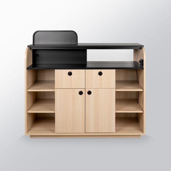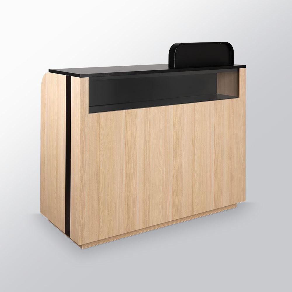 Disponible en acabado madera o negro,, incorpora vitrina expositora con iluminación LED, dos cajones con cerradura y un amplio espacio con doble puerta para mantener el área de bienvenida ordenada y segura. Incluye frontal protector para una atención más cómoda y discreta.