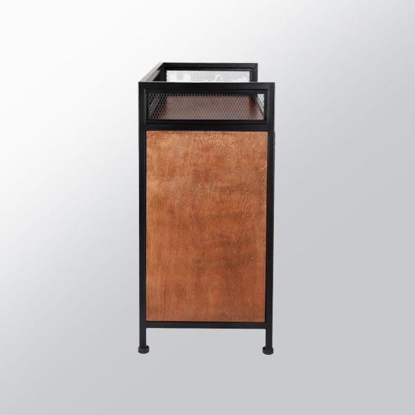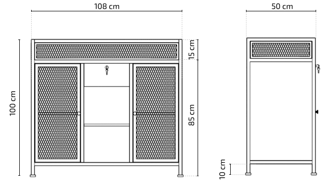 Fabricada en madera contrachapada y con estructura metálica en color negro, incorpora dos puertas con malla metálica y estante interior, además de un cajón con cerradura y llave para un almacenamiento más seguro y organizado.