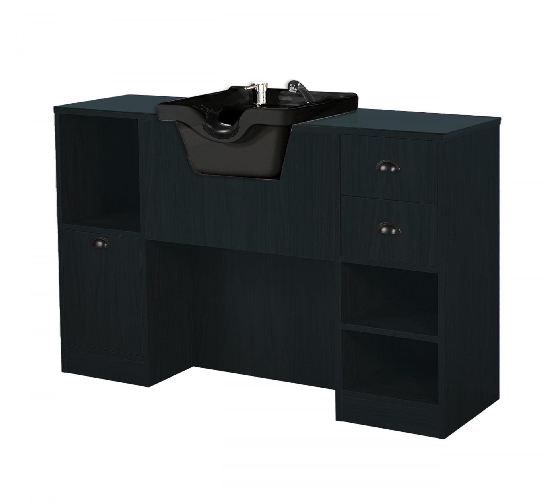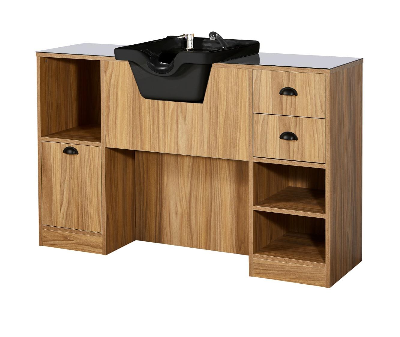 Tocador modular de barbero con lavacabezas cerñamicoi de color blanco, acabado en melamina. Permite construir una zona de trabajo a medida.