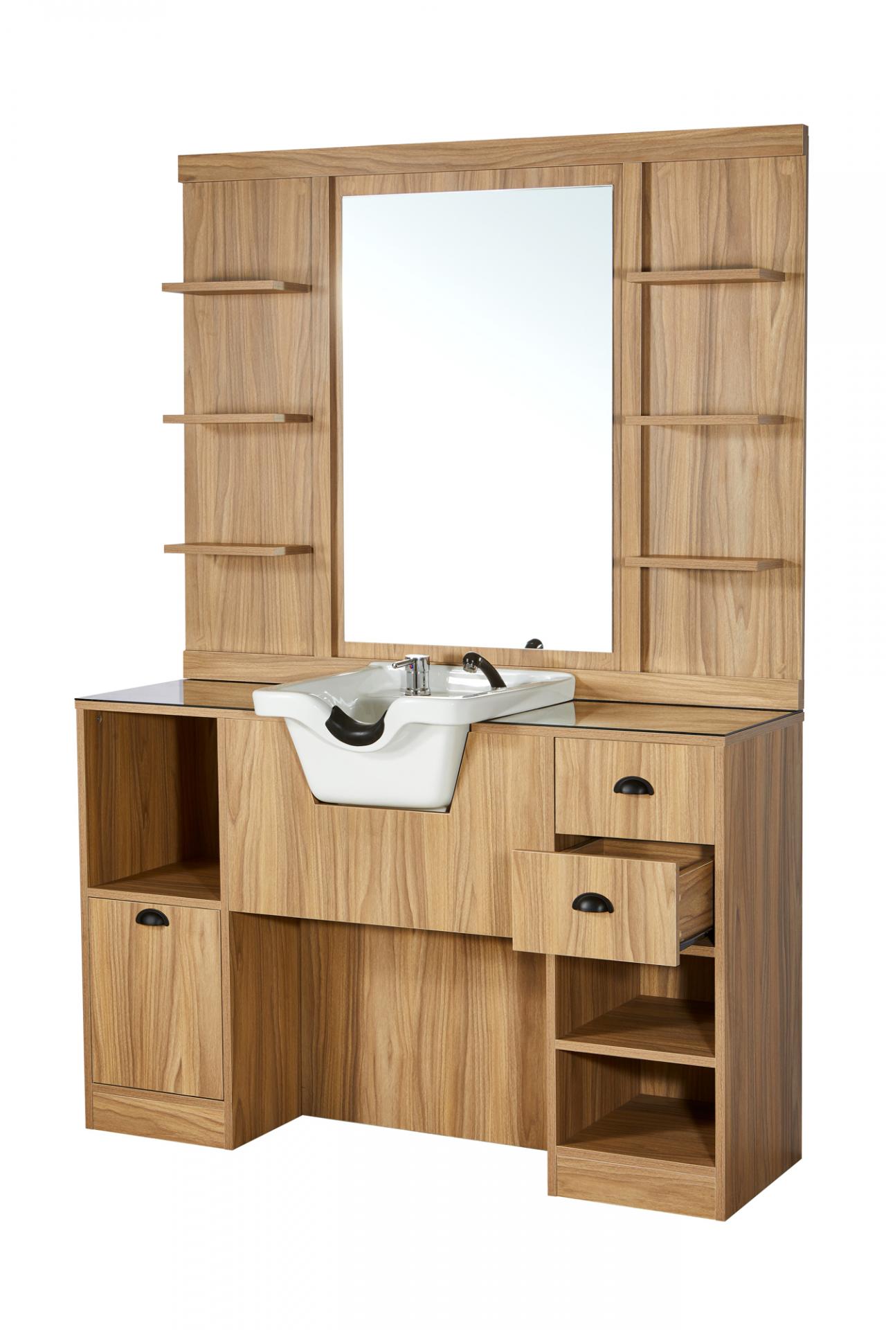 Tocador modular de barbero con mueble de espejo, acabado en melamina. Permite construir una zona de trabajo a medida.