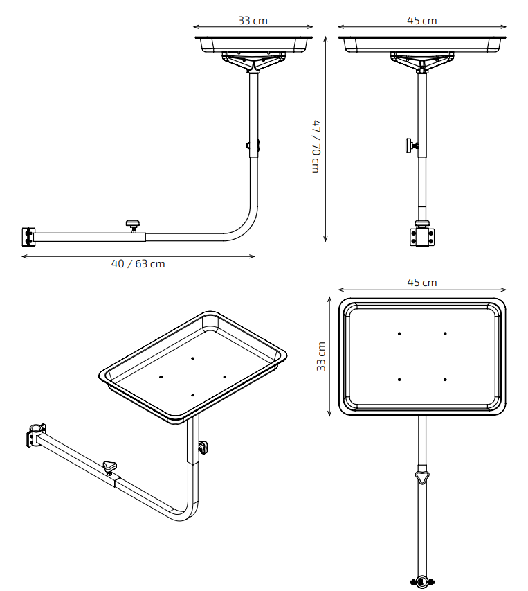 Bandeja ajustable fabricada en aluminio.