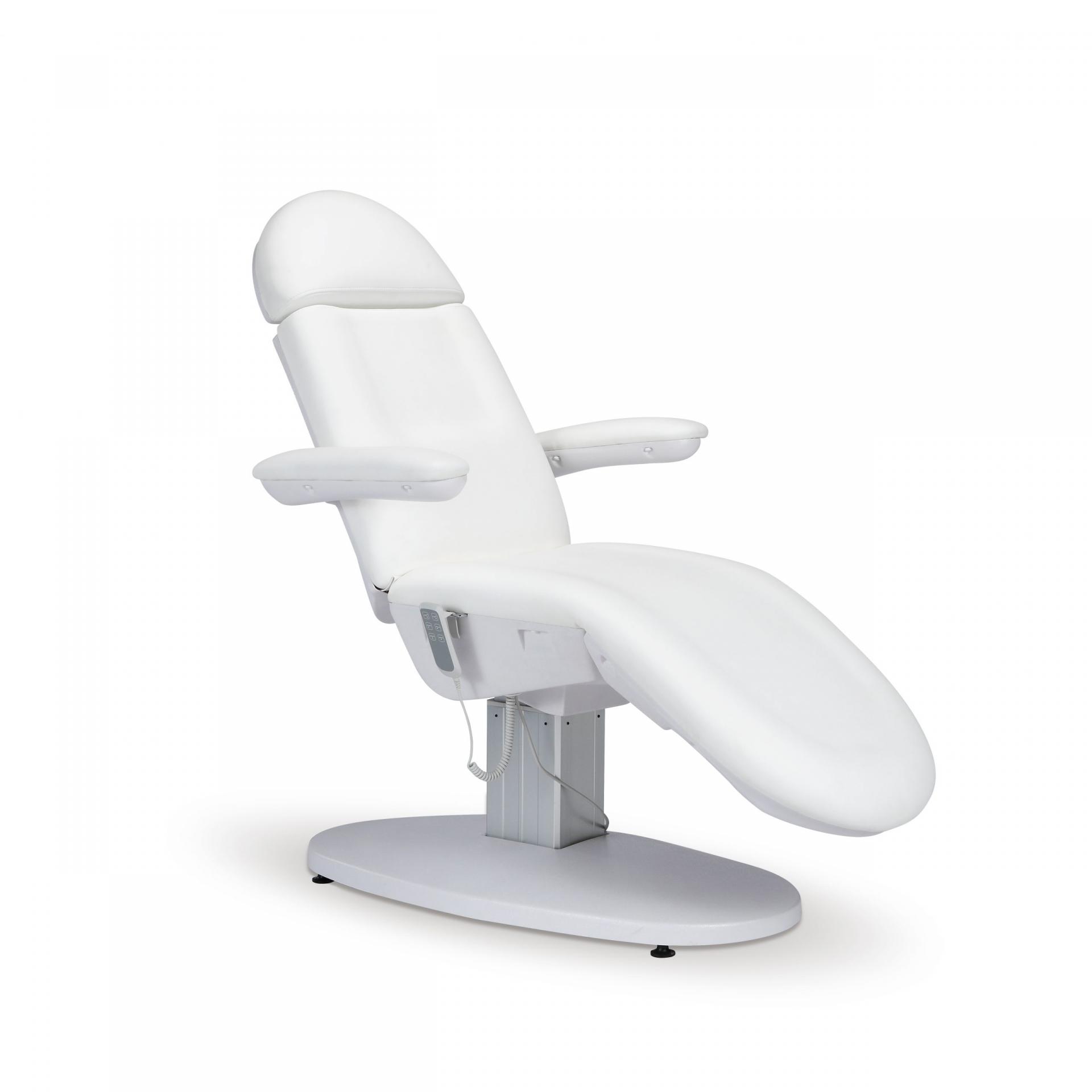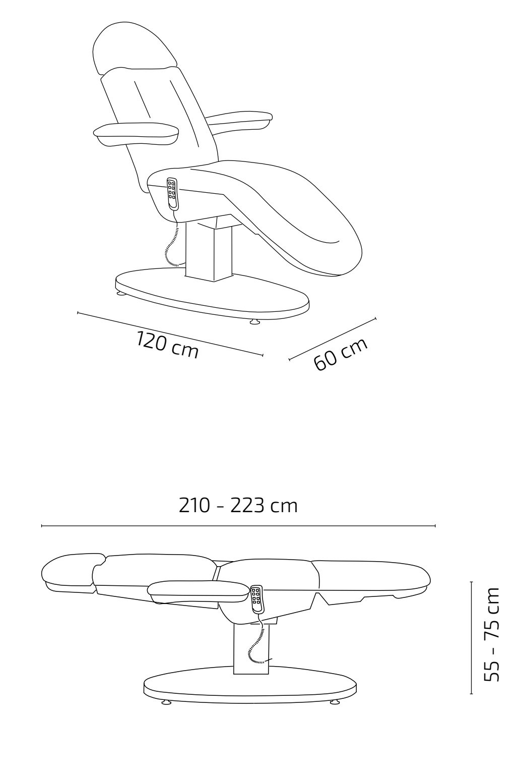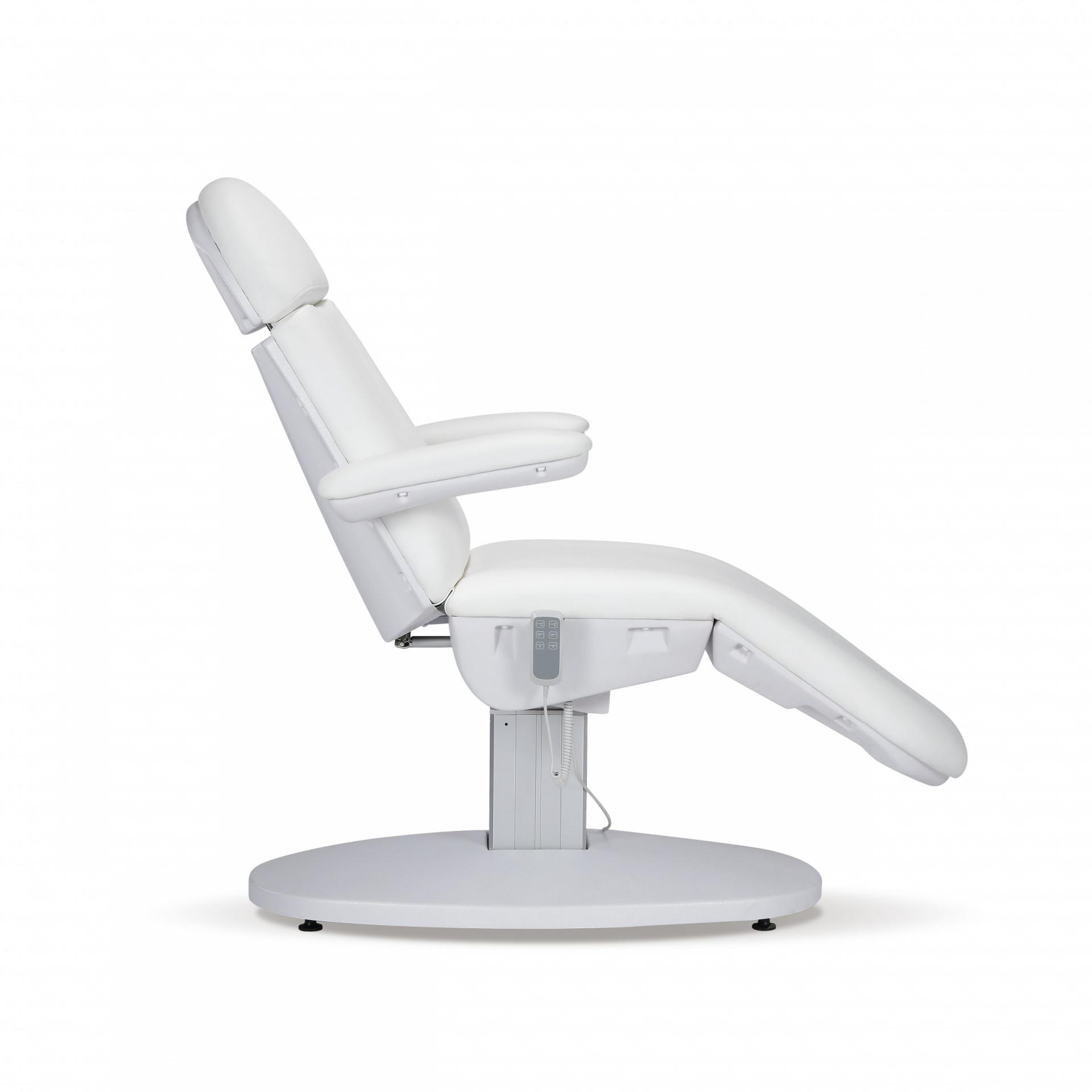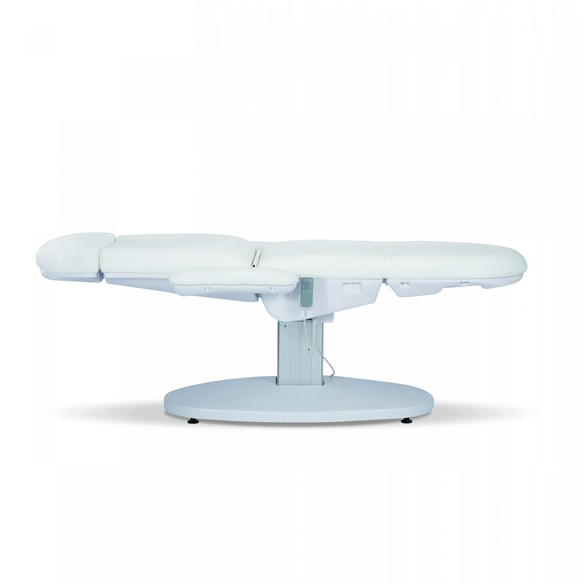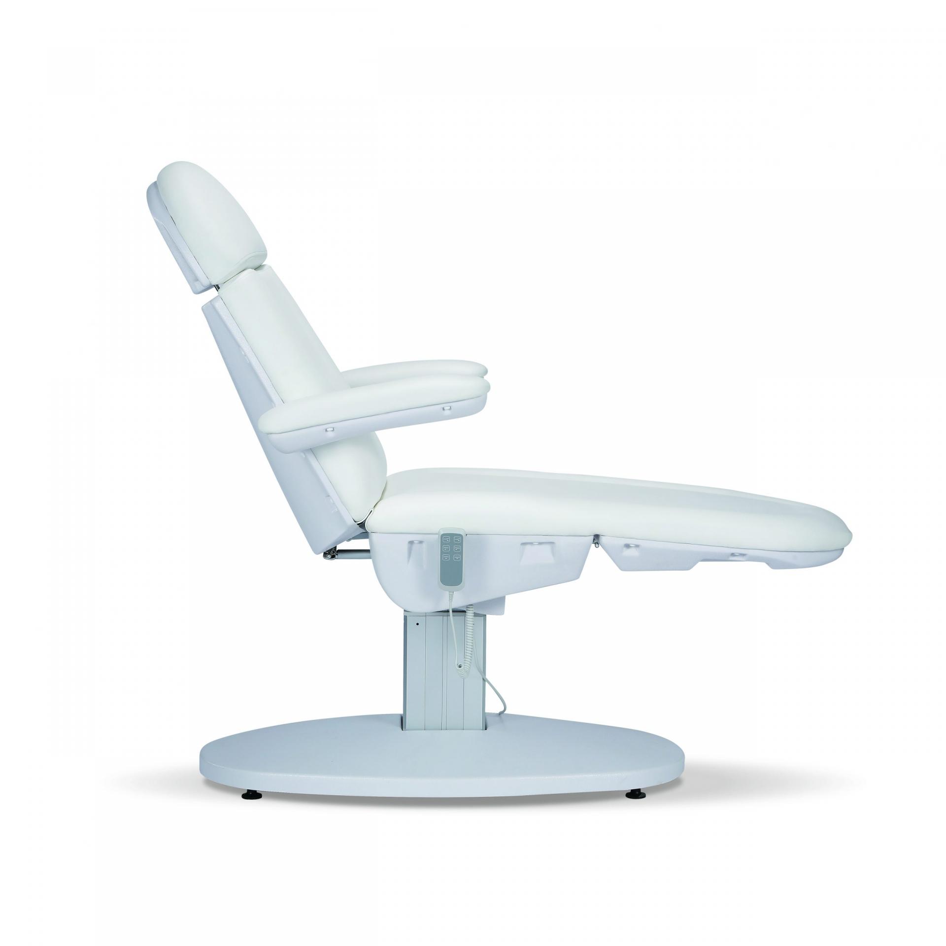 Camilla de estética de alta gama con estructura muy estable y robusta. Equipada con 3 motores que permiten regular la altura, la inclinación del respaldo y la inclinación del asiento. Reposapiés regulable mediante pistón de gas y reposabrazos abatibles. Control de pie opcional.