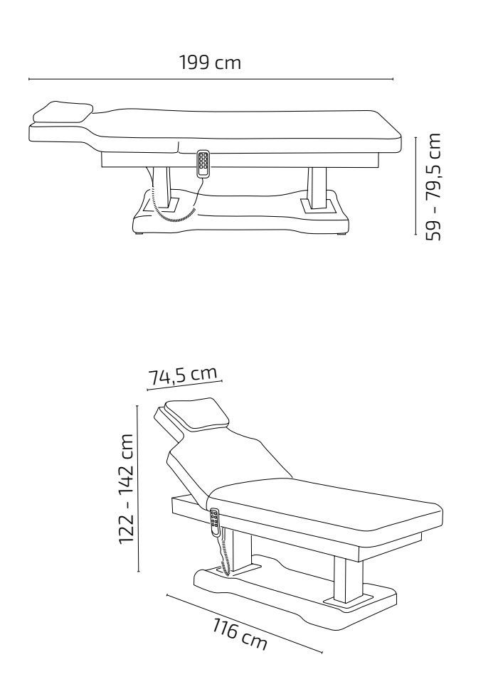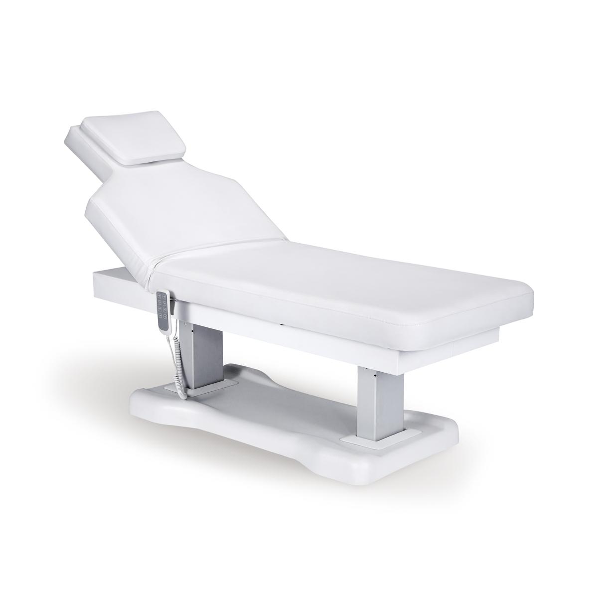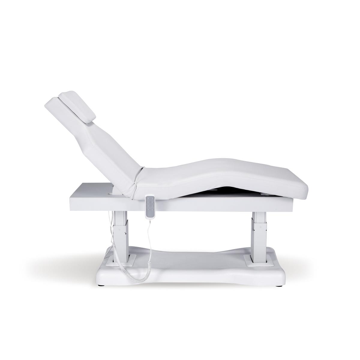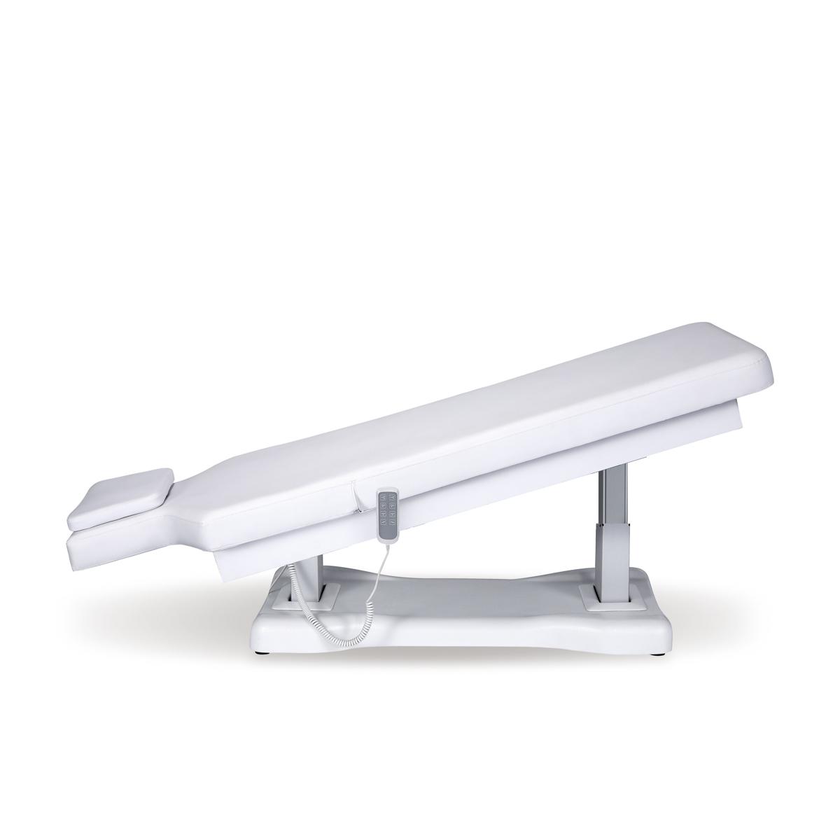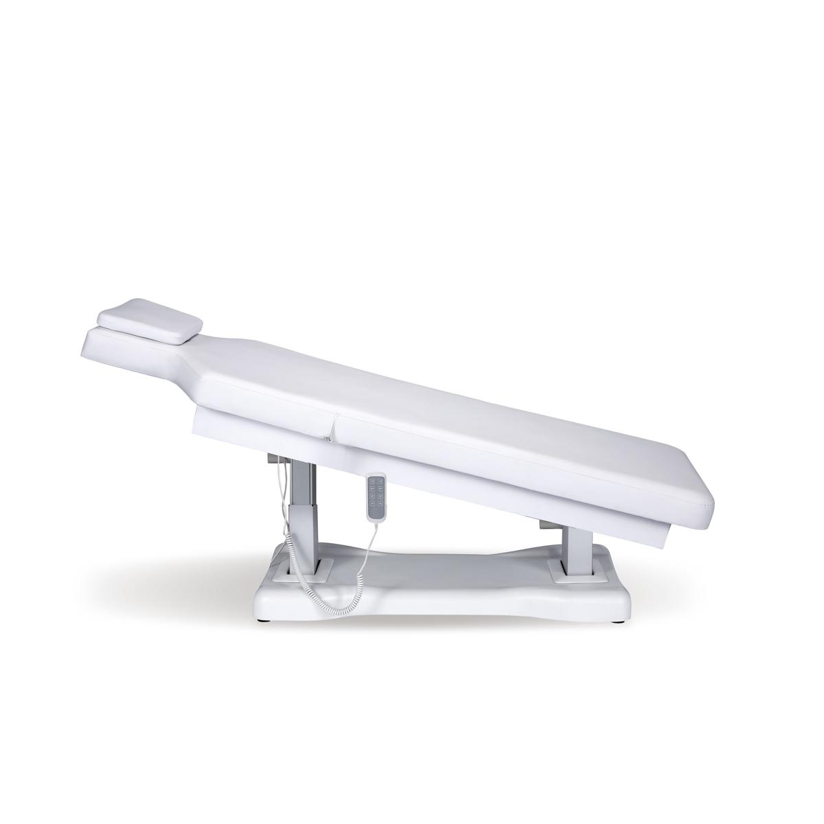 Camilla de estética de alta gama con colchón de una única pieza de 3 secciones. Equipada con 4 motores que permiten regular la altura, la inclinación del respaldo, del reposapiés y de toda la camilla.