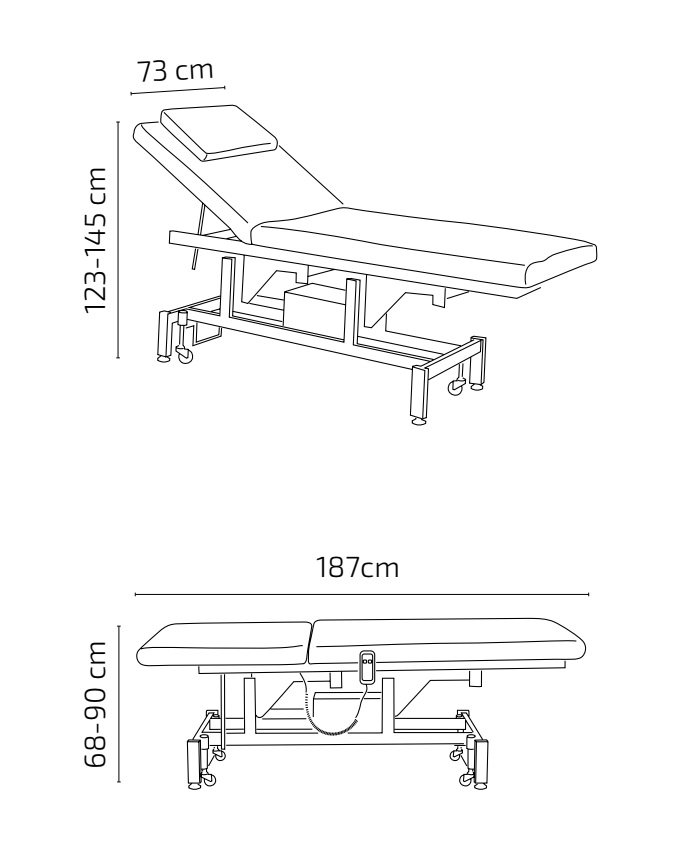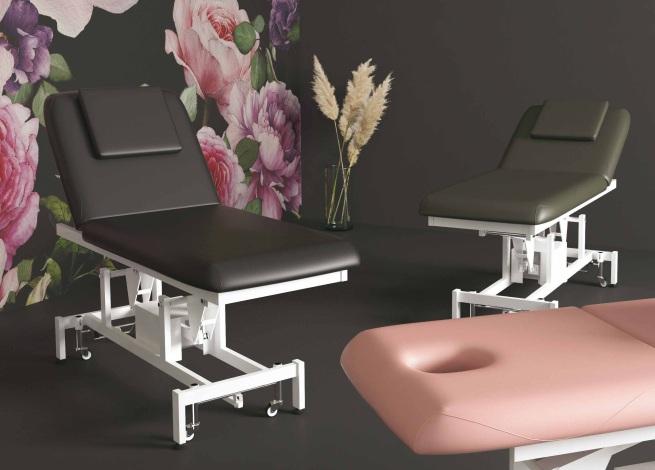 Camilla de estética de alta gama de 2 cuerpos con estructura muy estable y robusta.Equipada con un motor que permite regular la altura. El respaldo se regula manualmente.