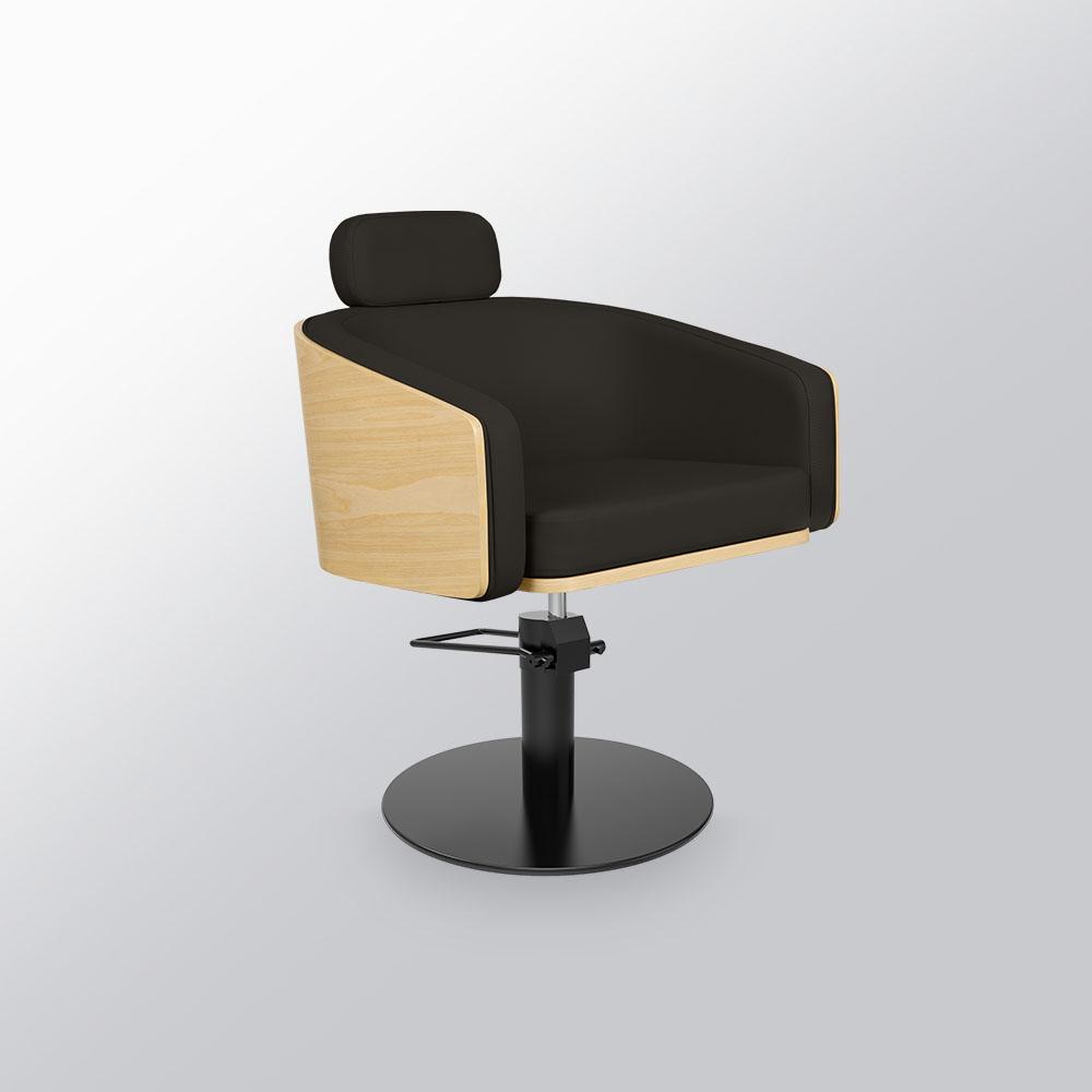 Tapizado en polipiel de alta calidad en color negro y con respaldo en chapa de madera natural, aporta calidez y un acabado muy distintivo. Su curvatura ergonómica mejora la comodidad durante el servicio. Incorpora bomba hidráulica ajustable en altura y diferentes opciones de base para personalizarlo según el estilo del salón.