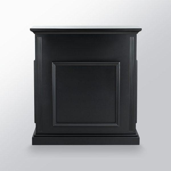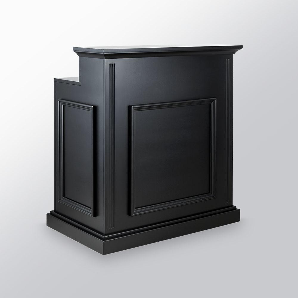 Recepción profesional de barbería en negro con acabado clásico