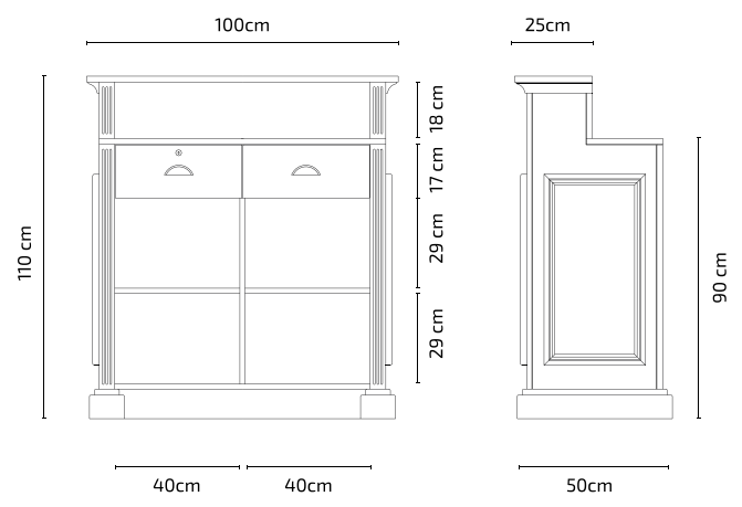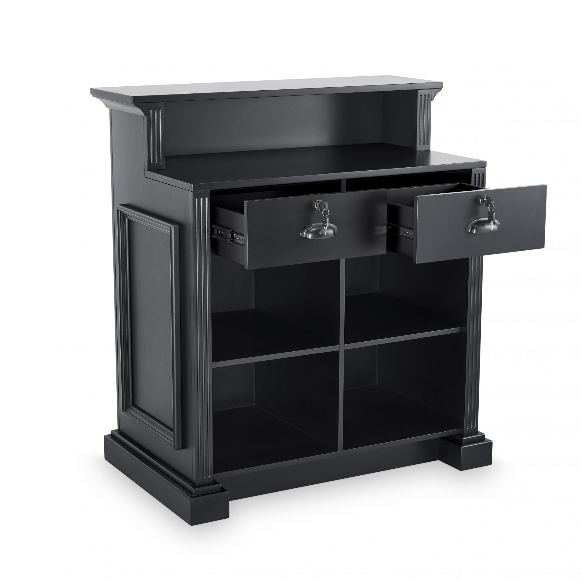 Fabricada con estructura de chapa de madera natural, incorpora molduras de madera maciza y barnizado en color negro para un acabado clásico y con presencia. Incluye dos cajones con cerradura y llave para un almacenaje práctico y seguro.